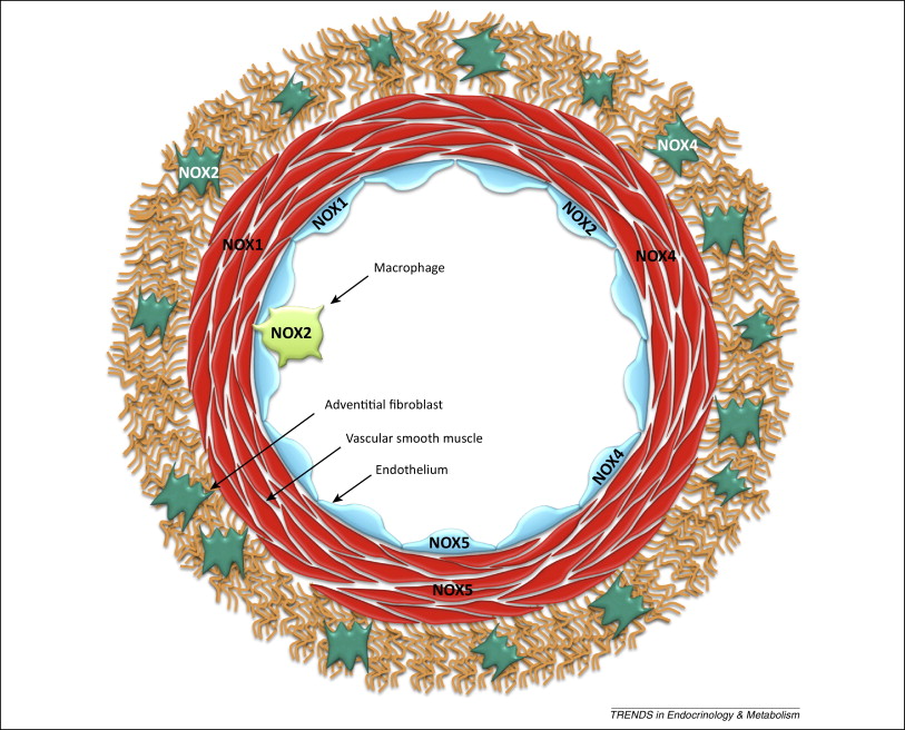 意义:活性氧在血管疾病中起重要作用。虽然活性氧有许多可能的来源,但烟酰胺腺嘌呤二核苷酸磷酸(NADPH)氧化酶起着核心作用。它们是“点燃自由基”的来源,而自由基会影响其他酶,如一氧化氮合酶、内皮型一氧化氮合酶或黄嘌呤氧化酶。这很重要,因为动脉粥样硬化(高血压、糖尿病、高胆固醇血症和吸烟)的危险因素调节血管壁NADPH氧化酶的表达和活性。最新进展:哺乳动物中有七种亚型:Nox1、Nox2、Nox3、Nox4、Nox5、Duox1和Duox2。Nox1、Nox2、Nox4和Nox5在内皮细胞、血管平滑肌细胞、成纤维细胞或血管周围脂肪细胞中表达。其他同系物未被发现或表达水平很低;他们的作用还没有确定。Nox1/Nox2可促进内皮功能障碍、高血压和炎症的发展。Nox4可能在应激时起到保护血管系统的作用;然而,当它的活性增加时,它可能是有害的。钙依赖的Nox5参与了人动脉粥样硬化的氧化损伤。关键问题:NADPH氧化酶衍生的ROS在血管病理和维持正常生理血管功能中发挥作用。我们还讨论了最近阐明的机制,如NADPH氧化酶在血管保护、血管炎症、肺动脉高压、肿瘤血管生成、中枢神经系统调节血管功能和高血压中的作用。未来方向:了解单个氧化酶和同源物在血管疾病中的相互作用,对于在实验室和临床有效地调节血管NADPH氧化酶是至关重要的。Antioxid。氧化还原信号,20,2794