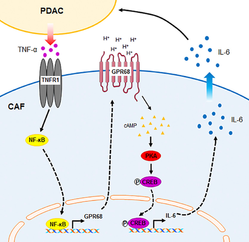 PDAC细胞-CAF相互作用和GPR68的示意图。 PDAC细胞释放TNF-α,从而增加PSC / CAF的GPR68表达。细胞外质子通过cAMP / PKA / CREB途径激活GPR68并增加IL-6表达。从CAF中释放/分泌的IL-6可以刺激PDAC增殖。