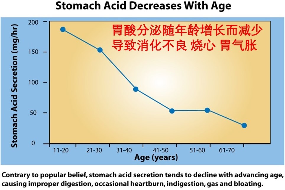 老年人胃酸分泌减少,是导致消化不良和容易感染的重要原因.神奇的身体把酸性代谢废物二氧化碳CO2做为原料制造胃酸。
