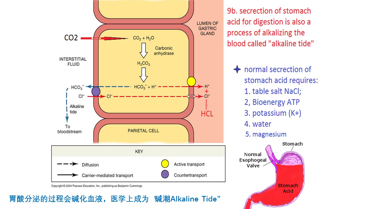 胃酸分泌的过程,就是消耗酸性的二氧化碳和使血液碱化的过程,分泌的胃酸越多,血液越碱,医学上,把进食过程中血液PH值的上升,称为碱潮(Alkaline Tide).