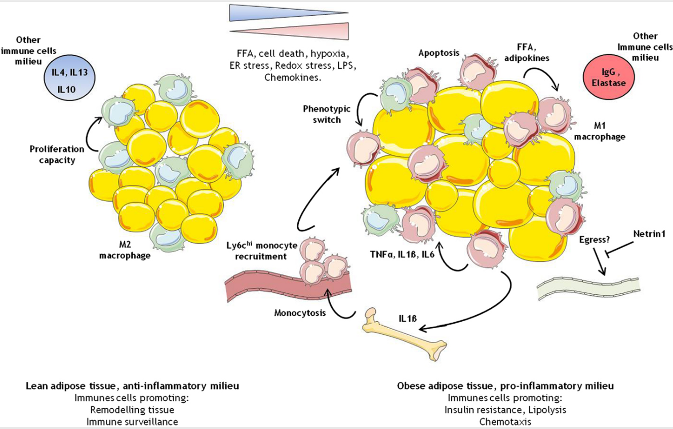 表达分析巨噬细胞和非巨噬细胞细胞群从脂肪组织分离表明脂肪组织巨噬细胞负责几乎所有脂肪组织TNF-α 的表达和大量iNOS和IL- 6表达。脂肪组织巨噬细胞的数量在肥胖中增加,并参与炎症通路,这些通路在肥胖个体的脂肪组织中被激活。